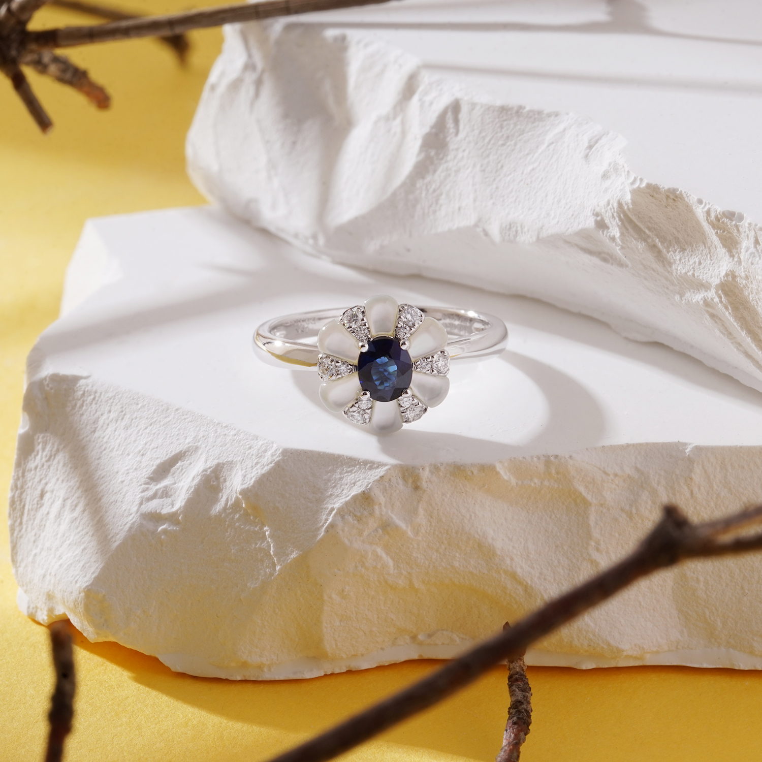 18K/750 白色黃金 天然鑽石/寶石/半寶石 戒指 金重:2.80克 美度:6.50 圓形 鑽石 總重量:0.120卡 1粒 藍寶石 總重量:0.470卡 半寶石- 珍珠母 總重量:0.990卡